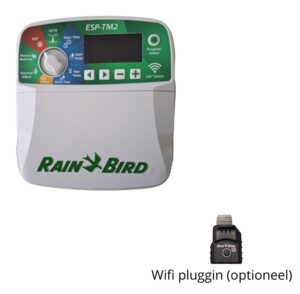 In deze pompset is een RainBird beregeningscomputer type ESP-TM2 opgenomen voor het aansturen van 4 kraanvakken. In deze uitvoering wordt de beregeningscomputer geleverd zonder wifi-pluggin.
